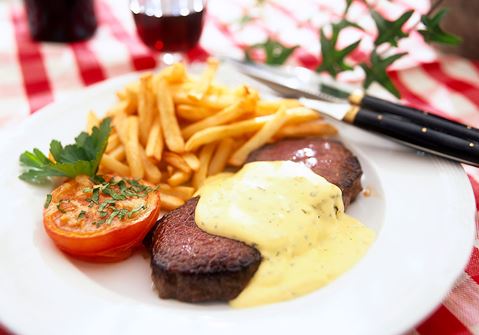 Stekt potatis eller pommes, bearnaisesås.