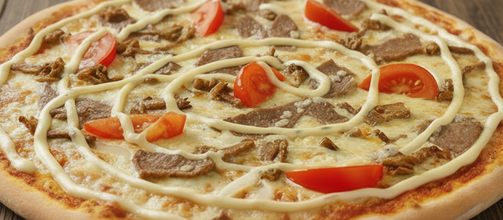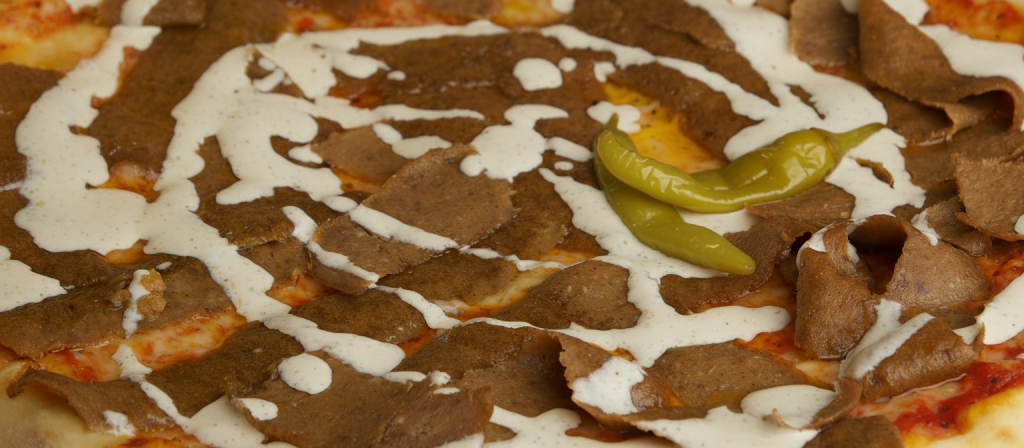 Skinka, lök, kebabkött, kebabsås