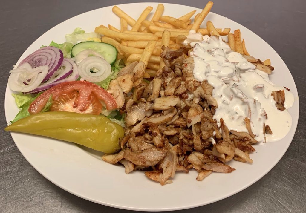 Sallad, pommes, tomat, gurka, lök, kebabsås. Välj mellan kebab och gyros.